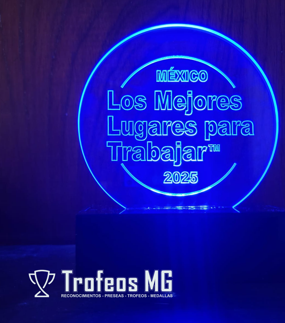 Reconocimiento de acrílico con un toque moderno y futurista. El grabado láser del diseño se ilumina con una luz LED brillante, creando un efecto visual espectacular. La base de acrílico con una placa sublimada permite personalizar la pieza, haciendo de este reconocimiento una pieza memorable y llamativa.