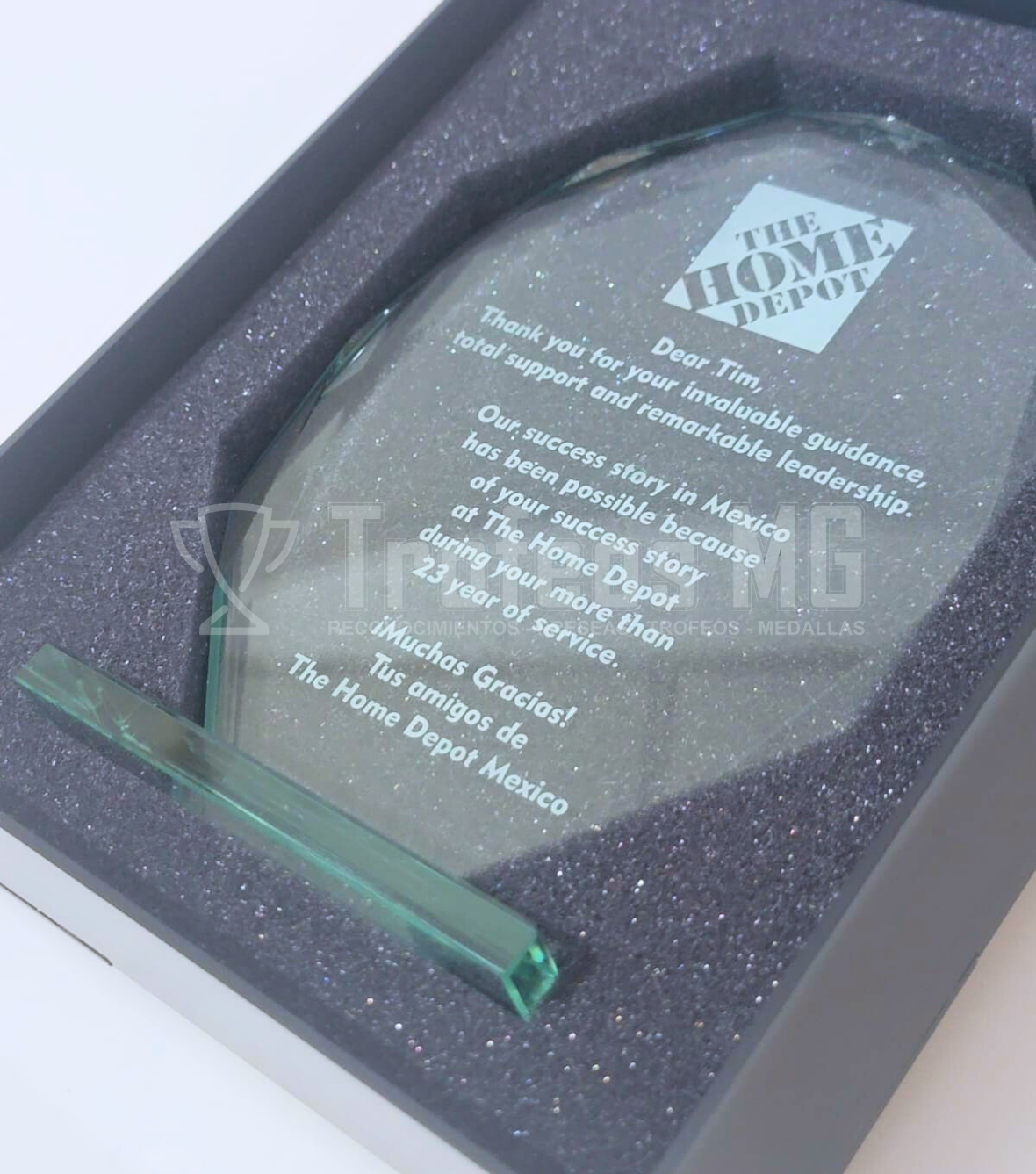 Descripción detallada para el producto: RECONOCIMIENTO EN VIDRIO JADE CON GRABADO LASER CON CAJA ESPECIAL EN ACRILICO.